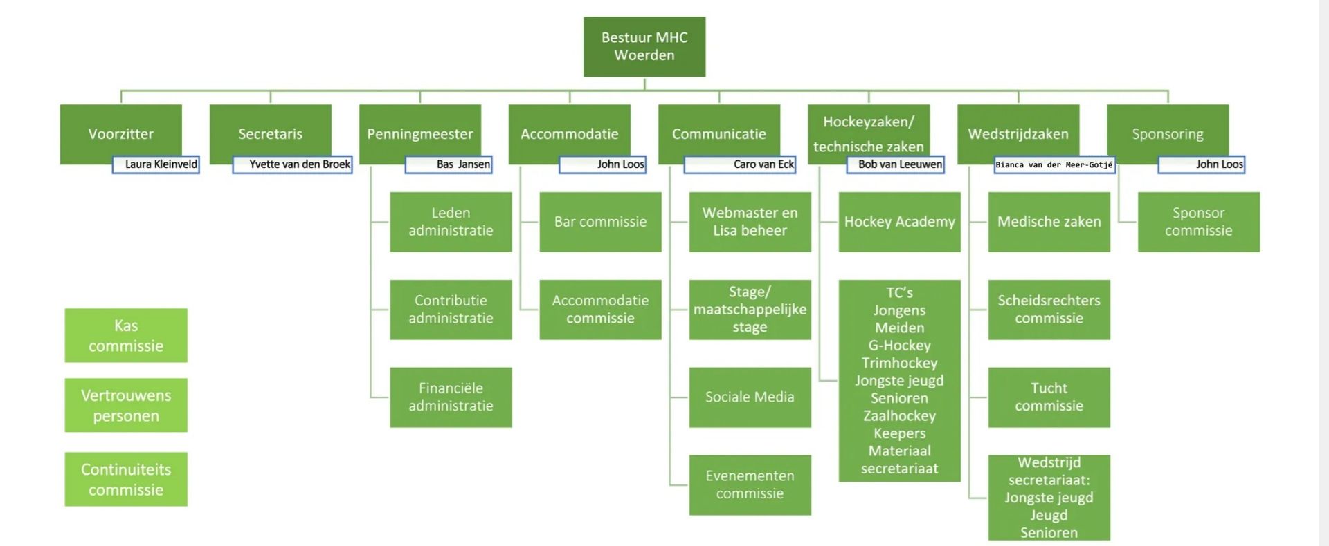 Het bestuur is belast met het besturen van de vereniging in algemene zin. Het bestuur heeft de taak, gelet op haar doelstelling en maatschappelijke activiteiten, MHC Woerden intern en extern goed te laten functioneren. Onder eigen verantwoordelijkheid handelt het bestuur in het belang van de vereniging, daarbij gestuurd door de statuten, het huishoudelijk reglement en het mede door de ALV vastgestelde verenigingsbeleid. De uitvoering van het financiële beleid wordt gecontroleerd door de Kascommissie. Het bestuur legt tweemaal per jaar verantwoording af aan de ALV. Zie de pagina 'Bestuur' voor een taakoverzicht.
